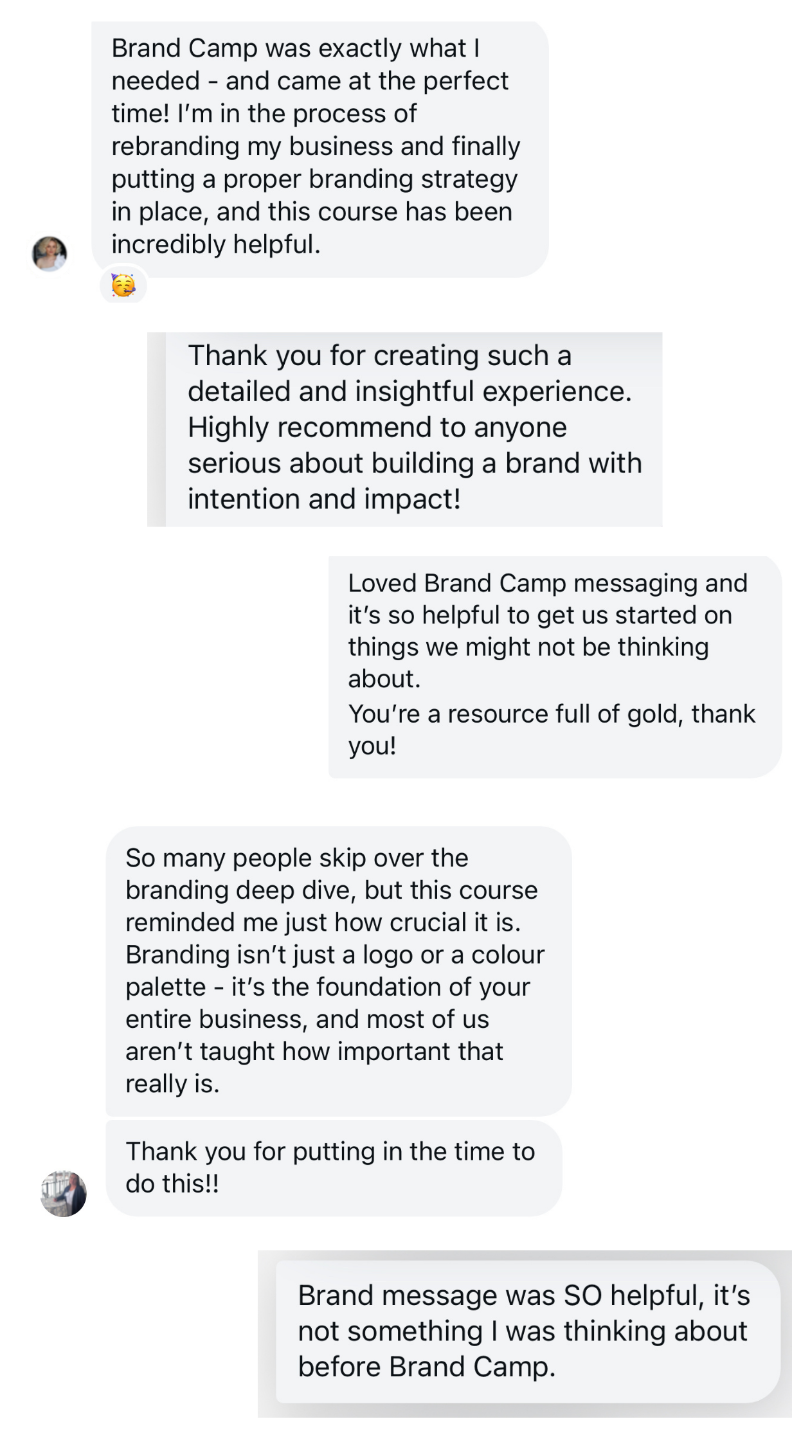 Inside Brand Camp, I’m teaching you how to build a lovable brand—the kind that people rave about, return to, and genuinely root for. You’ll learn how to align your brand with who you are (so you love what you’re building), and how to show up with such intentionality and generosity that your clients can’t help but love you back.